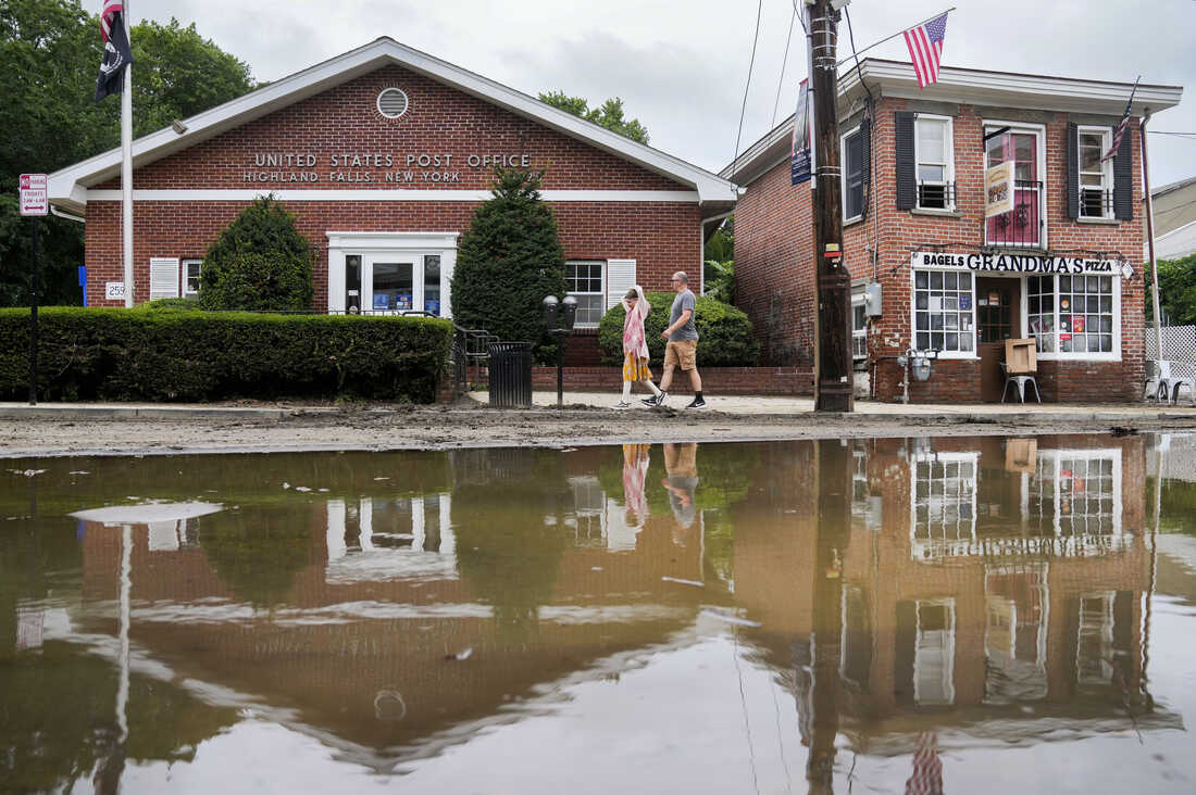 Πεζοί περνούν κατά μήκος της κεντρικής οδού που υπέστη ζημιές από πλημμύρες την προηγούμενη μέρα, Δευτέρα 10 Ιουλίου 2023, στο Highland Falls, NY John Minchillo/AP απόκρυψη λεζάντας