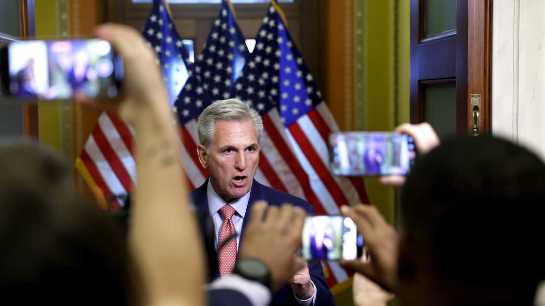 Οι δημοσιογράφοι χρησιμοποιούν τα κινητά τους τηλέφωνα για να βιντεοσκοπήσουν τον Πρόεδρο της Βουλής Kevin McCarthy να μιλάει στο Καπιτώλιο στις 25 Ιουλίου. Ο McCarthy κράτησε τη διαθεσιμότητα των μέσων ενημέρωσης με δημοσιογράφους για να συζητήσει μια πιθανή έρευνα παραπομπής κατά του Προέδρου Μπάιντεν που θα εστιαζόταν στο φερόμενο οικονομικό παράπτωμα της οικογένειας Μπάιντεν.